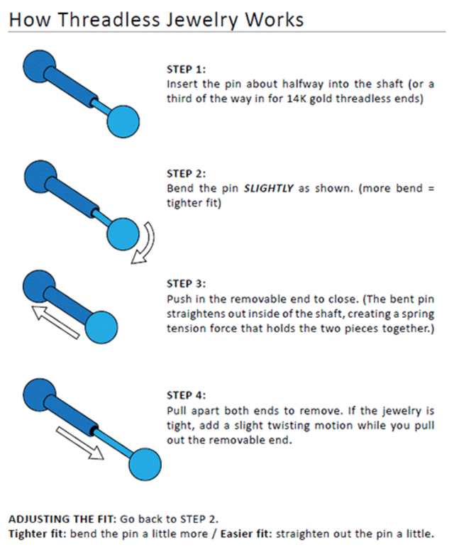 Système "threadless" (sans filetage). Bijou ni repris ni échangés pour des raisons d'hygiène.